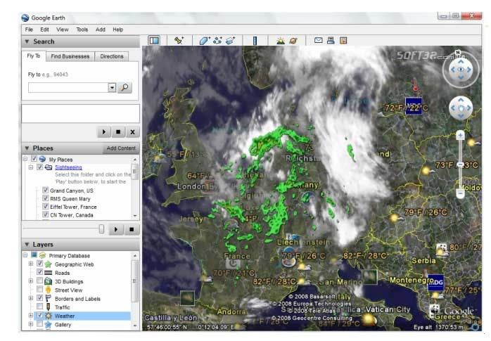 Mark your favorite places and tag them using icons or labels. You can even link to Youtube media. You can tilt your view and see mountainous terrain or you can even go sight seeing. You can find pretty much everything from street names to volcanoes. You can also use GPS devices with Google Earth. The weather conditions including temperatures are available as well.